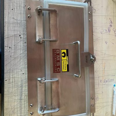 Rare earth magnetic plate magnets are custom fabricated to suit the application and where magnets needs to be mounted. This could be above or at the end of a conveyor, on a diagonal chute or any area that product can flow directly over or under the magnet. These can be supplied on an back plate with hinges which creates a door or on brackets for mounting. We provide and complete solution for the application and fitting of the magnet.